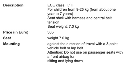 În primul rând să știți că fiecare scaun testat de ADAC are o pagină proprie unde este descris ce avantaje și dezavantaje are; din pagina principală cu lista scaunelor supuse la testare dacă dați click pe numele scaunului veți putea deschide pagina cu detalii, și vă încurajez să o faceți chiar dacă este în limba germana, cine știe limba are noroc cine nu, ca mine 🙂 se descurcă cu google translate, și mulțumim că a fost inventat 🙂