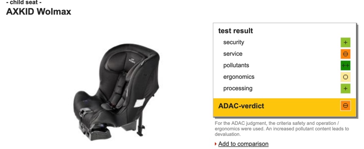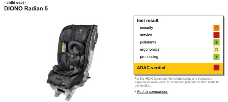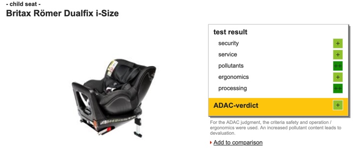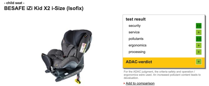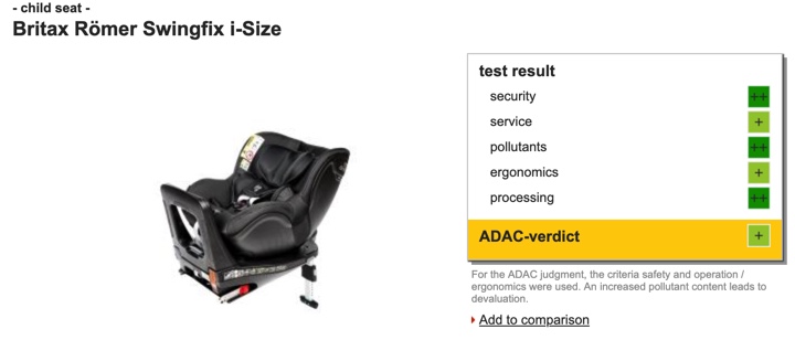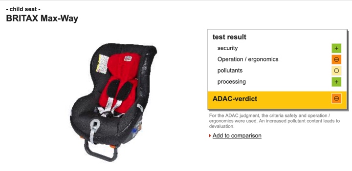 Conform testelor efectuate de ADAC în 2013 a obținut un rezultat de ansamblu suficient….dar de ce? până la urmă este un scaun cu testul suedez plus trecut, deci ar trebui să fie foarte bun, nu? Hai să vedem mai jos care este “problema” lui din punctul de vedere al celor de la ADAC.