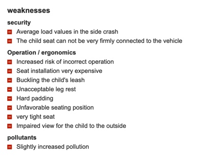 Acum, la ce a fost depunctat de a obținut un rezultat de ansamblu nu chiar bun din punctul de vedere al celor de la adac, în linii mari vorbind la modul de instalare, adică ei au spus ca nu poate fi instalat foarte ferm în mașină, că are un mod complicat de instalare, datorită centurilor adiționale, ceea ce poate duce la o instalare eronată. Și tot la partea negativă au găsit faptul că nu ofera prea mult loc la picioare copilului, că nu are o vizibiliate prea bună pe geam și că nu ar avea o poziție prea confortabilă.