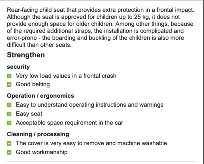 Dar uitându-ne la detalii putem vedea, chiar și doar grafic, că la aspectul siguranței are verde și un plus, asta înseamnă că până la urmă nu e chiar așa un scaun slab. Apoi chiar și cei de la ADAC spun că la un impact frontal, care statistic vorbind este cel mai des întâlnit tip de accident, valorile sunt foarte mici, ceea ce ne și interesează, cu cât forțele aplicate copilului sunt mai mici cu atât el iese mai puțin vătămat dintr-un accident, iar la impact lateral valori medii la fel ca multe alte scaune, deși aici este la aspectele negative. Tot cei de la ADAC spun că este un scaun ce are instrucțiuni de utilizare ușor de înțeles, necesită un spațiu rezonabil pentru instalarea în mașină și întreținerea lui este una ușoară, husa fiind ușor de îndepărtat și spălat.