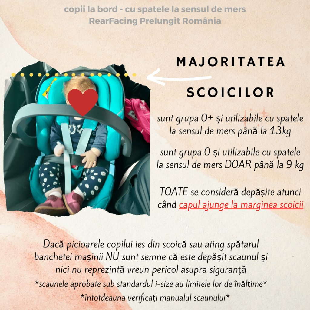 ATENȚIE!! – Majoritea copiilor ajung mai repede la înălțimea maximă decât la greutatea maximă permisă de producător, mai ales că majoritatea acestor scaune existente acum pe piață permit maximul de 13kg.