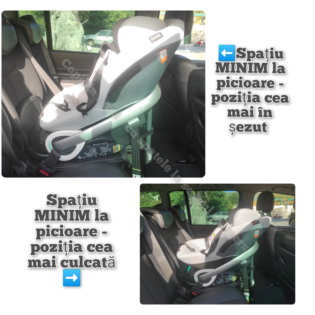 - Ajustarea barei de rebound pentru obținerea unui spațiu adecvat la picioare – foarte utilă, și care arată cu adevărat longevitatea utilizării scaunului – astfel acesta crește într-adevăr cu copilul, cei aproximativ 26cm disponibili la picioare făcându-l confortabil chiar și pentru un copil de 7ani. E normal astfel ca spre perioada de final a utilizării lui să necesite un spațiu mai mare în mașină. La instalarea cu spațiu MINIM la picioare are nevoie de aprox 74cm de la spătarul banchetei mașinii.