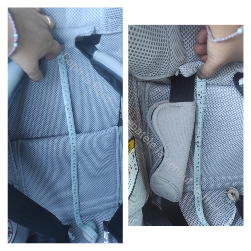 - Inserturi – scaunul vine automat cu insert din 2 bucăți care pot fi folosite chiar până la vârsta de 2+ ani dacă oferă confort și o poziție corectă a copilului în mașină. Modelul testat de noi nu este recomandat de la naștere, ci de la aproximativ 6luni, bineînțeles acest aspect este întotdeauna obiectiv pentru că depinde de dezvoltarea copilului, chiar și Besafe recomandă în continuare utilizarea scoicii pentru minim primele 6luni din viața nou născutului – au lansat și modelul Stretch B care are insert ca și modelele turn și twist, un insert mai rigid care se pune în scaun, un fel de scoică în scaun. Distanța minima necesară de la șezut la nivelul minim al centurilor este de ~26cm și cea maximă de ~46cm, cam asta ar trebui sa fie lungimea trunchiului unui copil să poată sta în scaun fără insert!