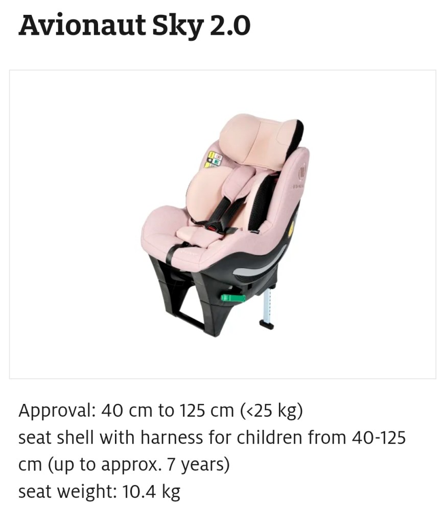 Avionaut sky 2.0 a obținut și el un scor bun la siguranță, dar din păcate l-au depunctat la instalare, la așezarea copilului, la poziția copilului, deși pe alta parte spun ca instrucțiunile sunt ușor de urmărit… Clasic pentru ADAC, din păcate în istoria acestor teste au arătat că nu sunt asa de mari fani ai acestor scaune depunctând și alte modele asemănătoare tot pe aceleași criterii. Până la urmă aceste aspecte sunt subiective, unii părinți se pot descurca mai bine alții mai puțin, și aici e nevoie de ajutor nostru al consultanților.